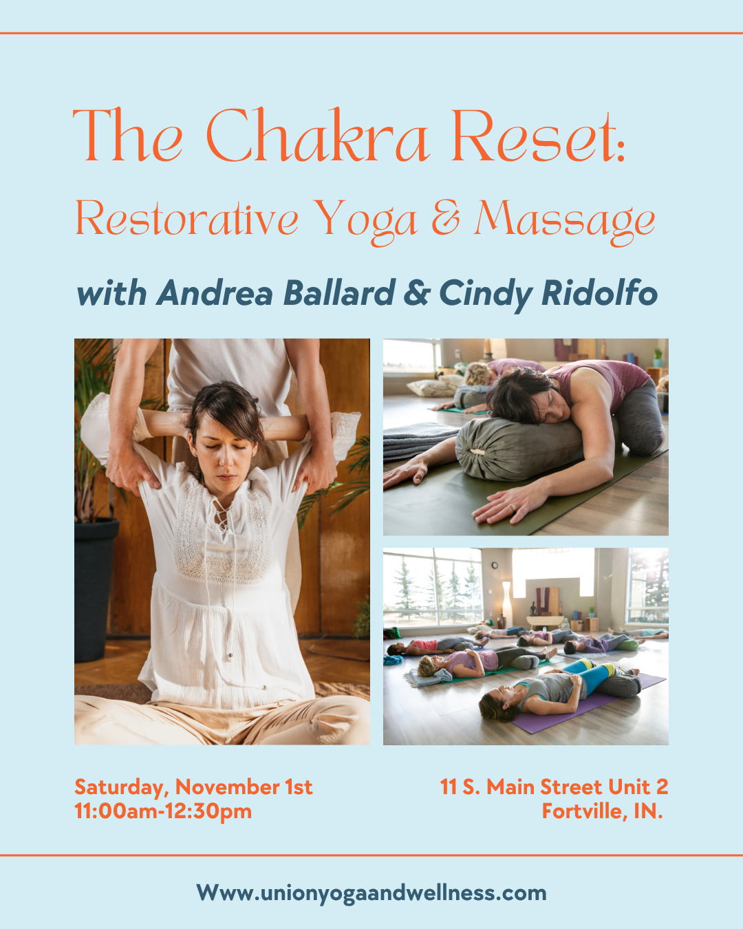 Step into a morning of deep restoration and self-care with Andrea and Cindy. Together, we’ll move through each chakra with gentle, restorative yoga postures, while Cindy provides soothing massage therapy in the poses—supporting your body, heart, and mind to fully release and restore.